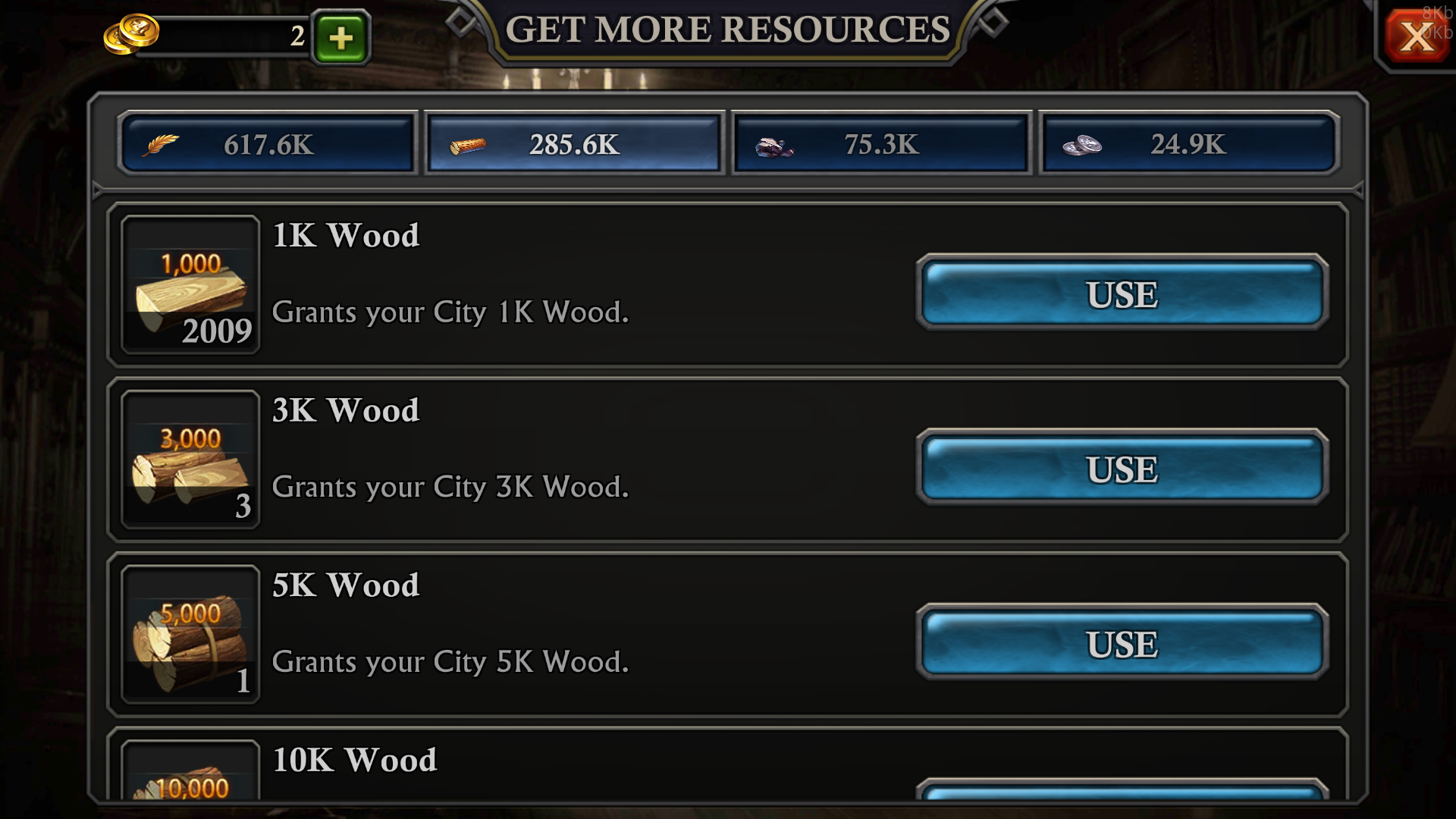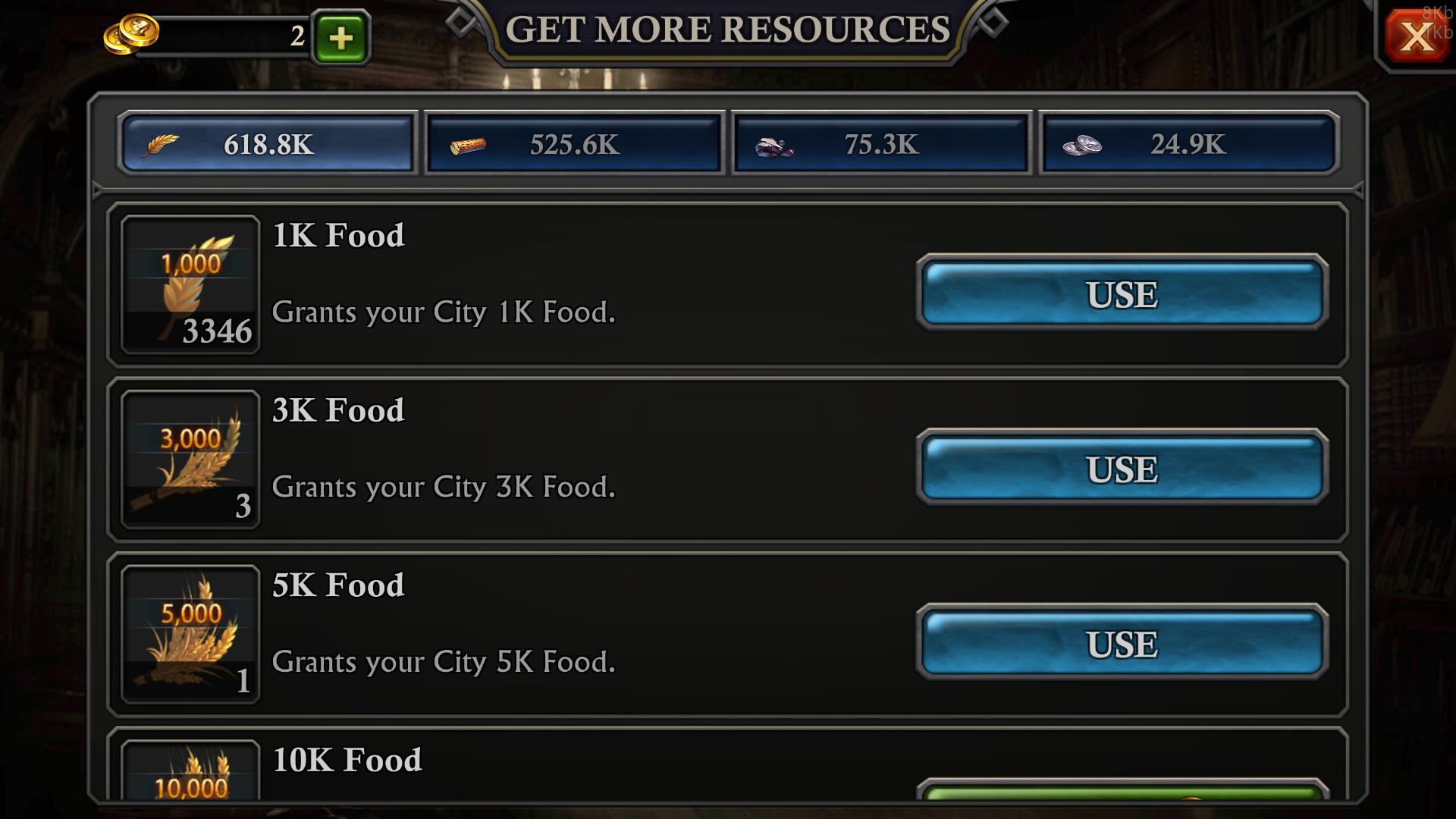 Raid camps and hunt monsters when you can. They are excellent sources of resource items. If I recall correctly, a level 15 (or 16?) cyclops has a nice chance of dropping 45 x 1k food or wood resource items. This really adds up quickly. Especially if you take your time to grow your troops and get the Monster Stamina Talent.